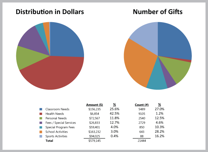 These graphs were made, during their previous incarnation, to track funds raised over time and their distribution during the previous year